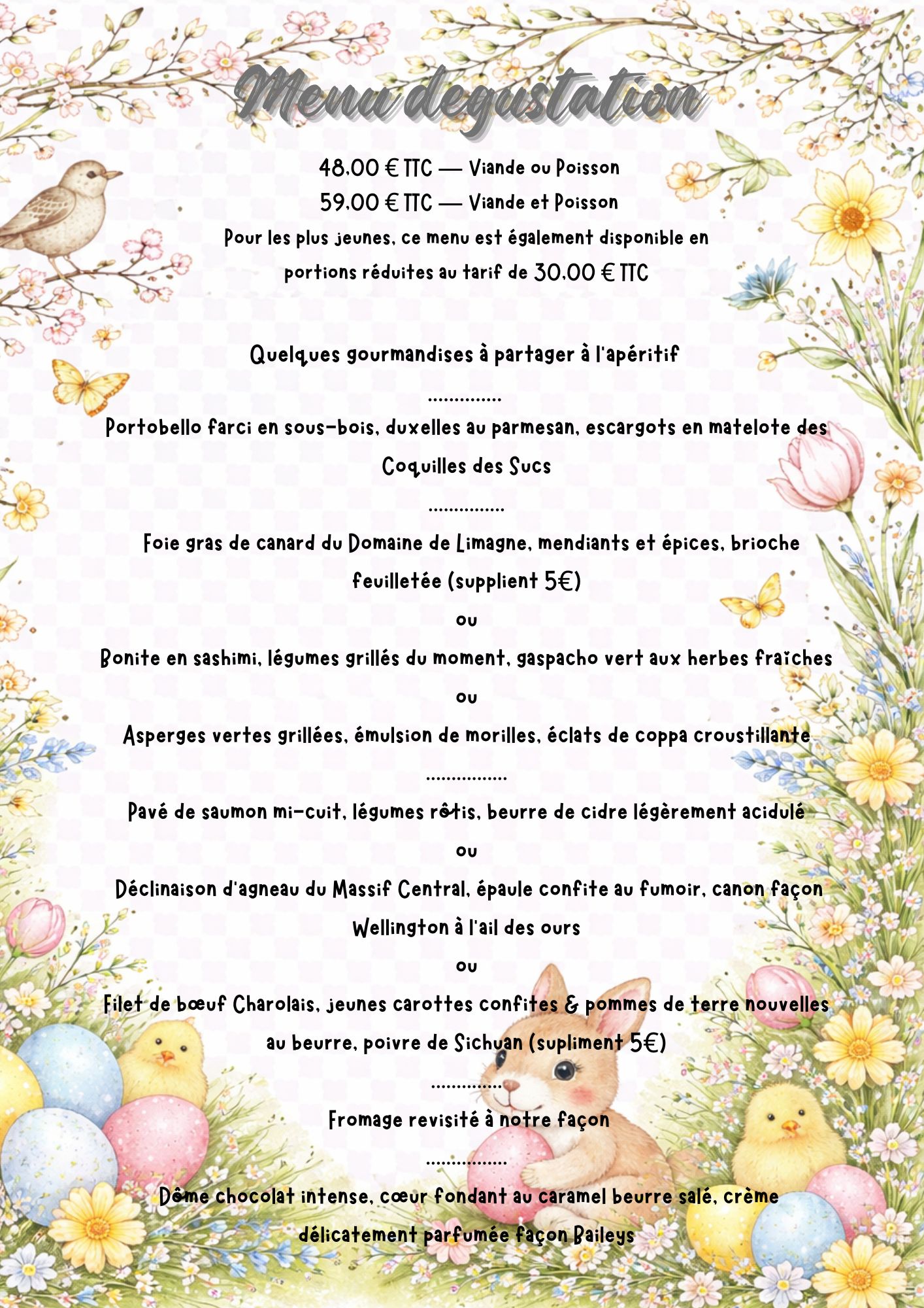 À l’occasion de Pâques, le chef vous propose un menu de saison autour des premiers produits printaniers : asperges, jeunes légumes, ail des ours et agneau du Massif Central. Une cuisine sincère et gourmande à partager.